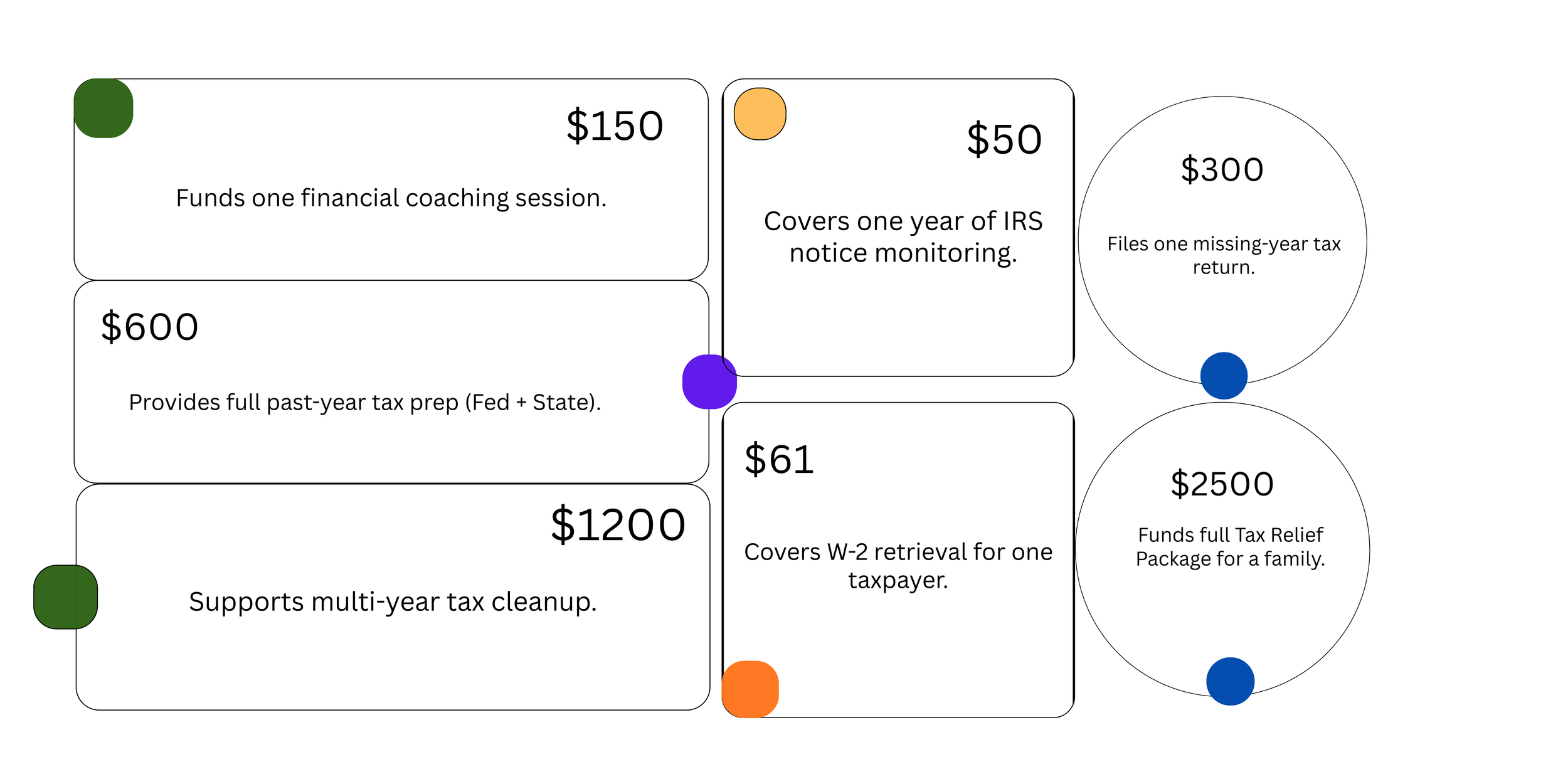 Your contribution helps us continue offering free tax support, planning, education, and relief services to families who need it most.